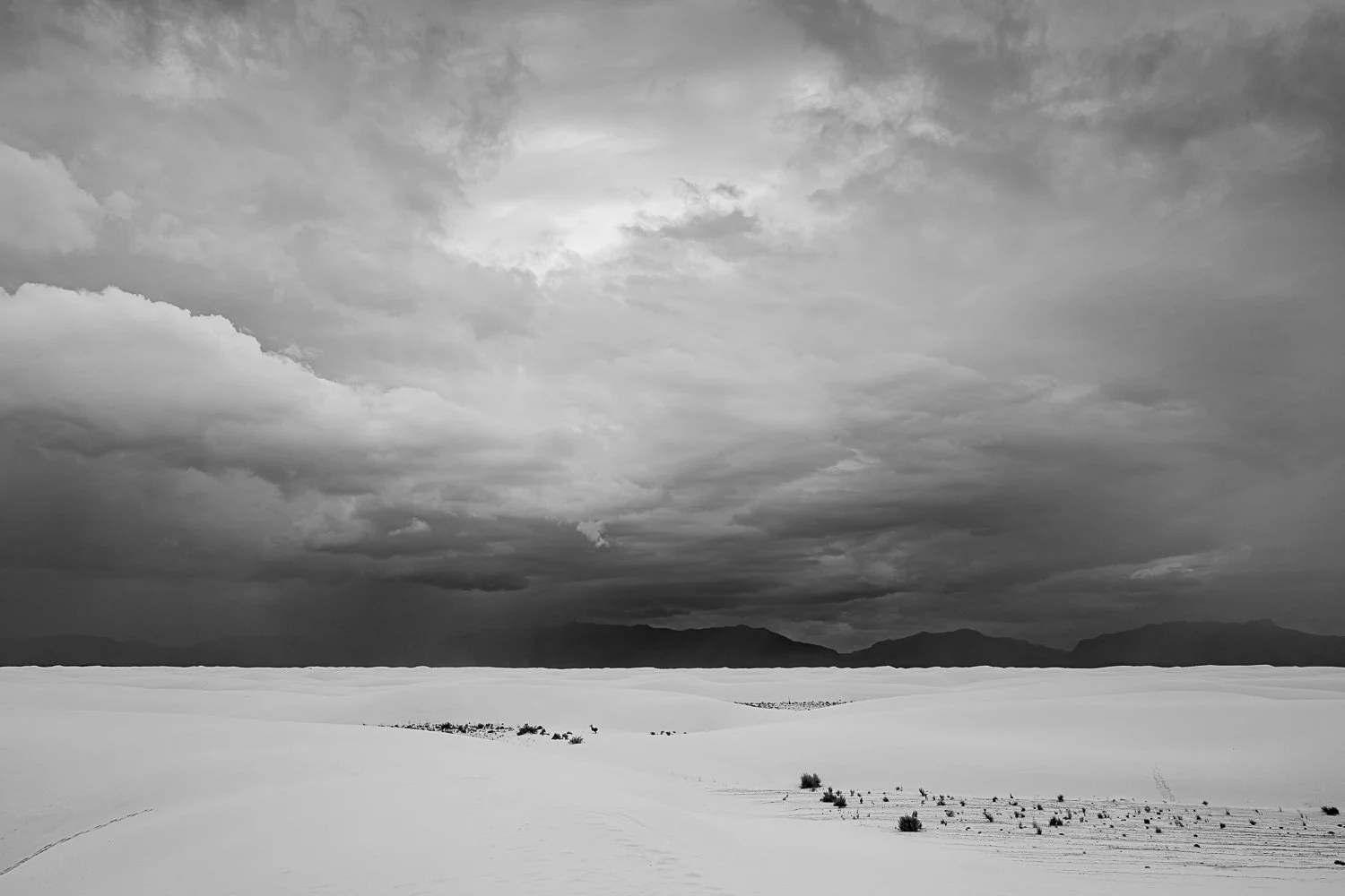 This is my favorite image from my trip. The storm has darkened the horizon and rain begins to obscure the silhouette of the San Andres Mountains. The sand —- smooth and white —- offers a stark contrast to the unsettled sky. The scrub plants break up the monotony of the sand, and the clouds roil up and out towards me. I was awestruck, small in the white expanse, exposed to the gathering storm. They say in a black and white photo the tones from black to white and all the grays in between (50 at least) create interest, and I think that’s happening here. Better yet, the photo shows how I felt about the place at that moment.