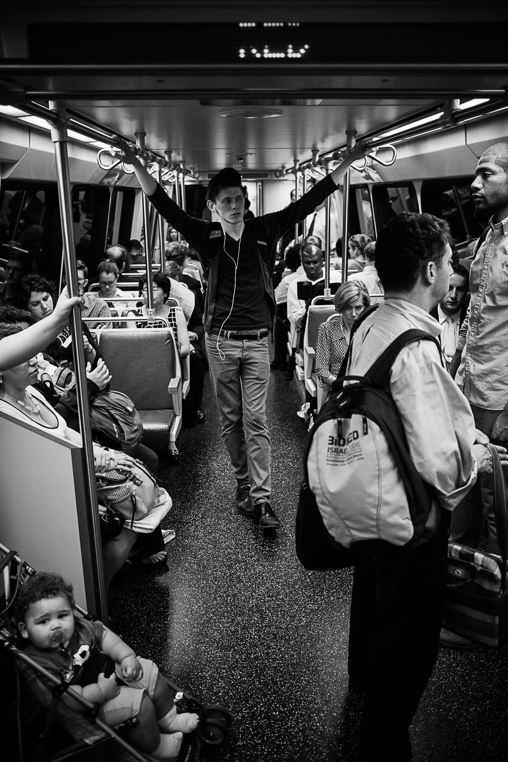 For the better part of 12 years I rode the Washington, DC, Metro to work and back home, boarding at Cleveland Park, changing at Metro Center or Gallery Place/Chinatown, and ending up at Smithsonian or L’Enfant Plaza. Before I got my first camera I just rode and observed —- commuters, tourists, interns, military personnel, families, couples, school groups. I thought about where they might have worked or what sight they’d visit that day, where they came from. Most people read —- the free WaPo paper, the Wall Street Journal, the NYTimes, sometimes a book, but mostly Blackberries, iPhones, tablets, and laptops. Some people invited a story —- this one’s off to a job interview, that one hurried out the door and mis-buttoned her blouse, he’s got a presentation today, they’re visiting from Iowa for the first time.