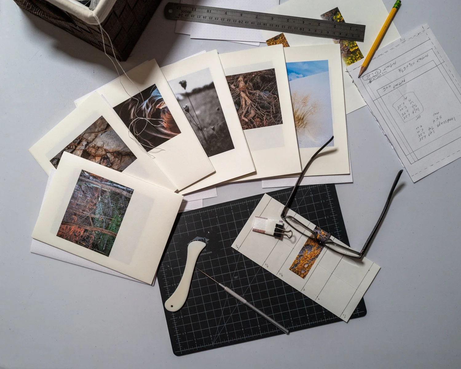 Since my inspiration for this book is —- unapologetically —- Eliot Porter’s Intimate Landscapes, I scoured my archives and made some new images to fit the theme. I wanted the photos to show me in the act of getting closer, looking down or within what’s part of the grand landscape. Many of these are from recent hiking excursions in the desert Southwest, others as old as 2014. I was looking to make 6 signatures of 6 photos each, 5 photos to fit a 5 x 8 space and one 9 x 6 photo for the center spread of each signature. Each signature is held together by a theme —- water, color, texture, leafiness, monochrome, curviness. I also wanted plenty of white space to isolate each image. I used Inbe paper from the Awagami paper factory in Japan because I wanted something that was pleasant to touch. I’m still working on the order, and I’m thinking about adding a seventh signature to hold the center of the book.