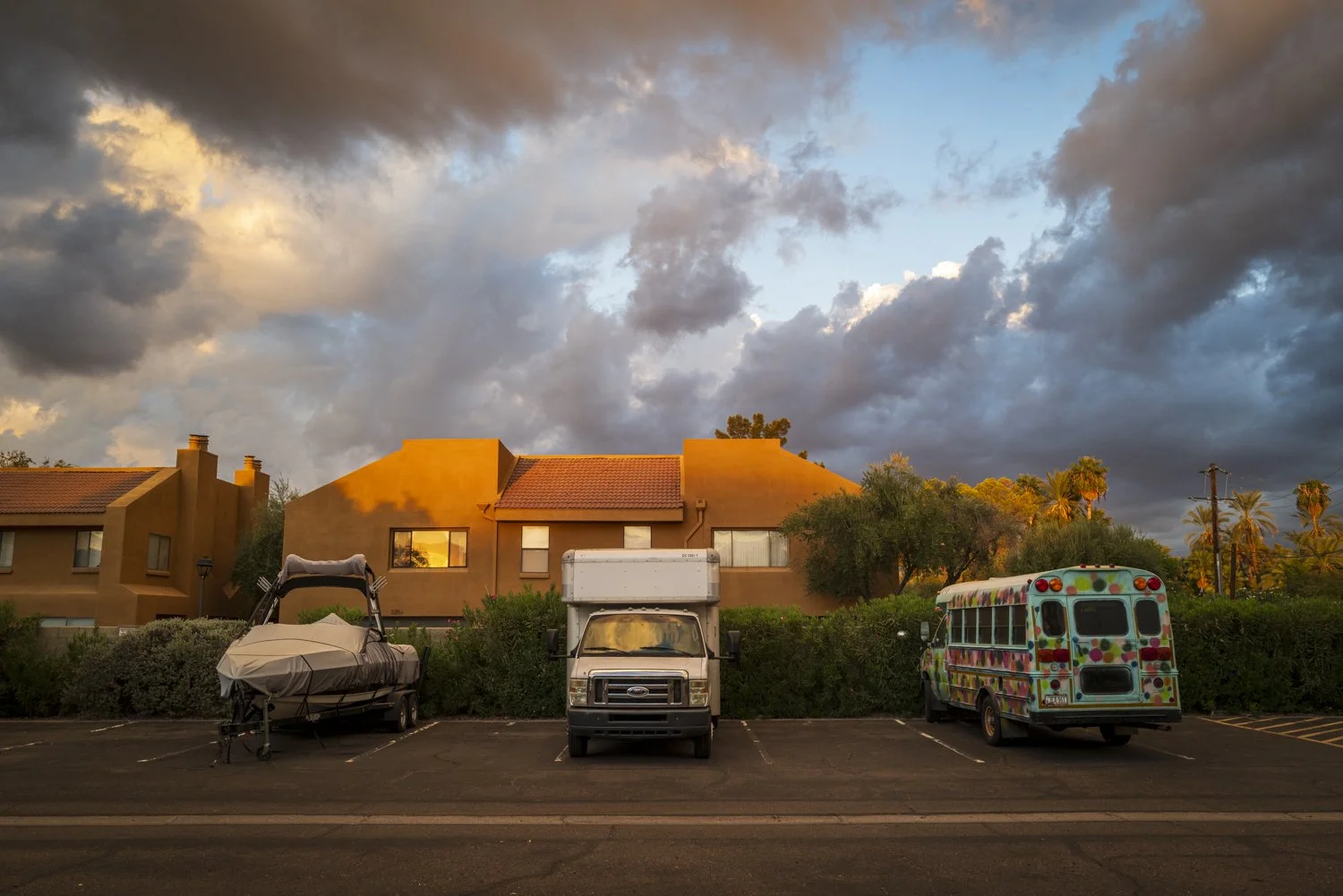 We live in a neighborhood that I think of as devoid of views, no one’s idea of the sweeping vistas that you want to greet you and your coffee in the morning. Our home faces north and shares a wall with our neighbor on the east. To the south, on the other side of a deteriorating block wall, another neighbor. And if you look west over the top of our garden wall, you see this. The boat has been bound and tied in that spot since we moved in, the magic bus began yellow, turned blue, and during the pandemic broke out in colored spots. The panel van is a mystery that comes and goes. The townhouses, Broadmor II, are for the most part lifeless; we know people live there only because the trash and recycling trucks empty the bins every week. In the distance you see some palm trees, date and Mexican fan, and a power pole that our neighborhood hawks sometimes visit —- to the dismay of our local doves.